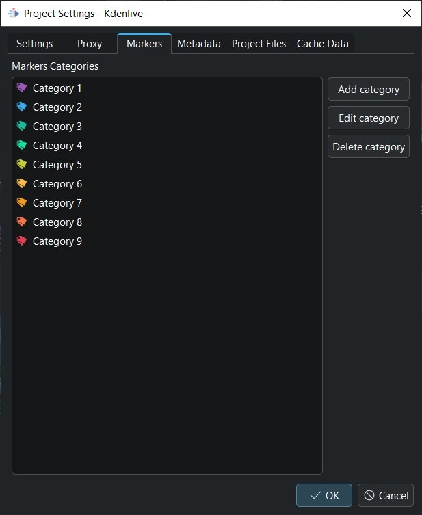 When starting a new project the categories for the project are pulled in from Markers Categories in setting Configure Colors and Markers. These categories are for markers and timeline markers.