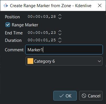 Now the advantage is, that you can select this zone marker in the markers windows and drag it to the timeline. In this way you can mark interesting parts of a clip with zone marker instead of Insert Zone in Project Bin and creating sub clips.