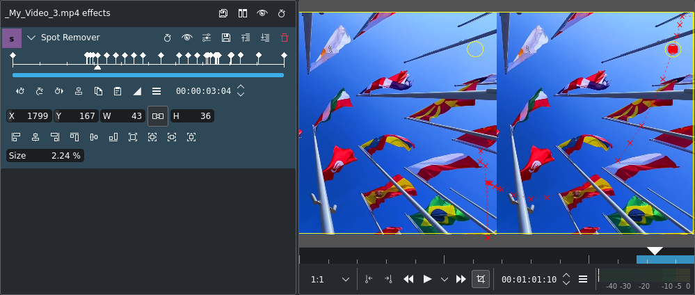 En este ejemplo muestra el efecto Eliminar manchas en acción: Un pájaro que cruzó por la pantalla es eliminado del video final. Para propósitos demostrativos se muestra el video original del lado izquierdo, del derecho el video con el pájaro eliminado. La posición del pájaro está indicada por el círculo amarillo.