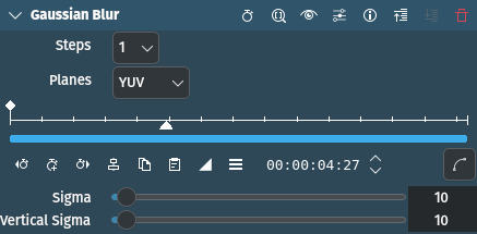 Este efecto permitirá desenfocar el clip, aplicando una función gaussiana (conocida del campo de la estadística, como una expresión para la distribución normal). De forma predeterminada, todos los planos del video serán afectados. Haciendo que el efecto actúe sobre distintos planos (p.ej: rojo, verde, azul) será posible lograr resultados artísticos interesantes.
