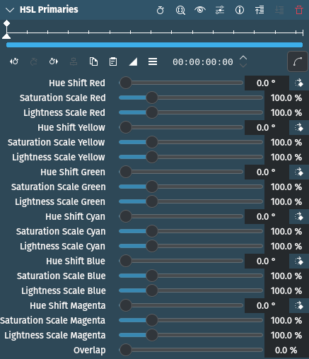 Permitirá ajustar el tono, la saturación y la luminosidad para cada uno de los tres colores primarion (rojo, verde y azul) y los tres colores secundarios (cian, magenta y amarillo). El espacio de color TSL es útil para realizar modificaciones de color sutiles.