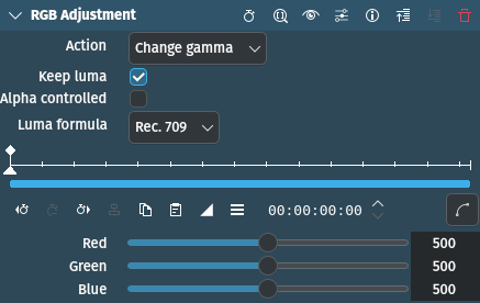 Este efecto permitirá realizar un ajuste simple de color en los canales RVA de la imagen de un clip, bien sea mediante la adición de una constante o la modificación de los valores de gama o ganancia de los canales.