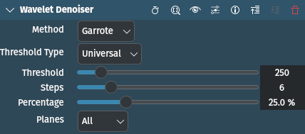 Reductor de ruido basado en ondículas[1]. Transformará cada fotograma de un clip en un dominio de ondículas, usando el método de Cohen-Daubechies-Feauveau 9/7[2]. Luego aplicará un filtrado a los coeficientes obtenidos. Después aplicará una transformación inversa de ondículas. Debido a las propiedades de las ondículas, debería producir un resultado suave agradable y una reducción de ruido, sin desenfocar los detalles principales de la imagen.