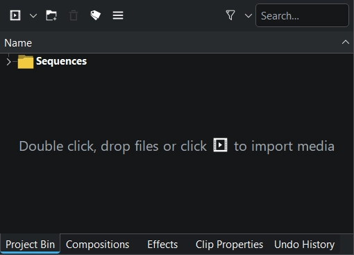 Esta es la forma en que luce el panel Medios al iniciar Kdenlive o al crear un nuevo proyecto. Nótese la presencia de la carpeta Secuencias, que contendrá todas las secuencias que sean creadas.