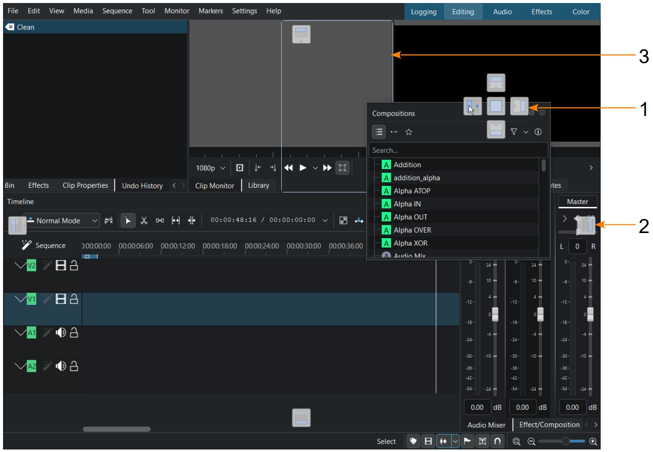 Organización predeterminada del espacio de trabajo de Kdenlive: Edición (clic para agrandar)¶