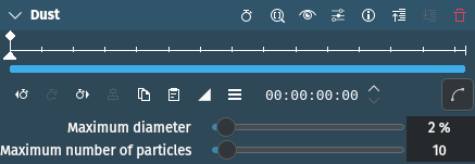 Questo effetto / filtro fa apparire delle particelle di polvere sull’immagine sorgente in modo casuale. Ciò conferisce al video l’aspetto di un vecchio film. Vedi anche gli effetti Simulatore di vecchi film, Grana della pellicola, e Righe dei graffi
