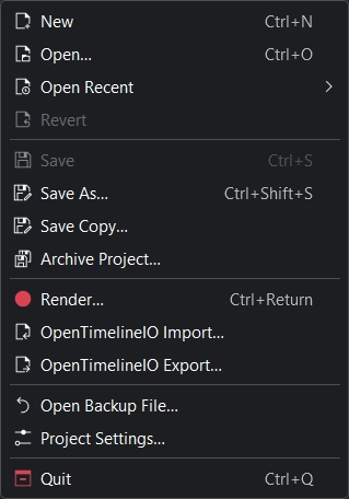 Il menu File contiene le normali operazioni sui file, ad esempio l’opzione per importare ed esportare i file di progetto utilizzando il formato OpenTimelineIO.