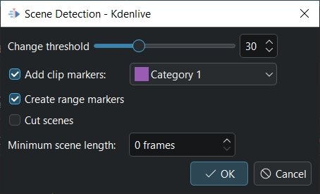 This job detects scene changes in the clip and creates markers and/or range marker and/or cuts the clip into sub-clips. The Change threshold determines the difference in the video stream to be considered a scene change. You may need to experiment with this parameter to get satisfactory results for your specific situation and source material.
