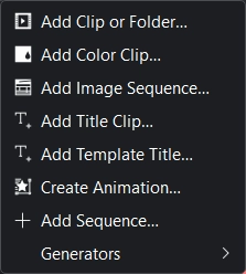 This function is also available from the menu bar of the Project Bin and by right-click on empty space in the Project Bin. See the Clips section in this documentation for more details.