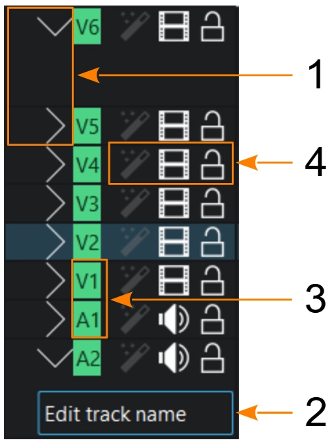 Intestazione della traccia: quest’area visualizza i dati nell’intestazione della traccia, quali il tipo di traccia (V sta per video, A per audio), il suo numero, la traccia con gli effetti o senza, se è nascosta oppure se è muta, se è bloccata o no, e anche un nome facoltativo. Ciascuna traccia può essere regolata individualmente in altezza, oppure espansa o collassata. Qui puoi trovare una descrizione più dettagliata. Per il menu del tasto destro vedi la sezione apposita.