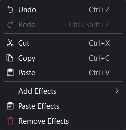 This menu item will open a flyout with all the effect categories from which you can then select an effect to be added to the track effect stack. See also the Effects and Filters section of the documentation.
