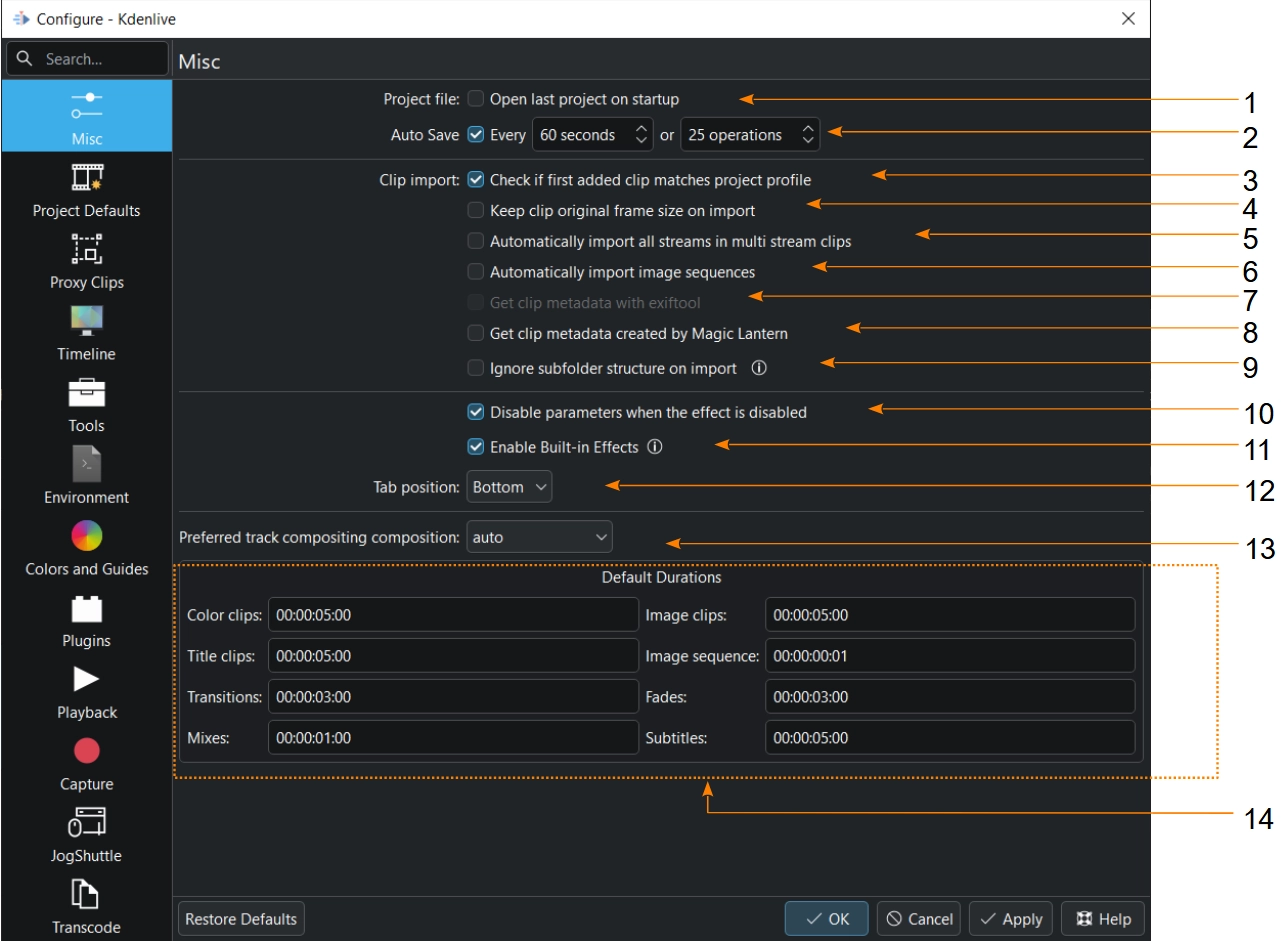 У розділі Інше містяться параметри загальної поведінки Kdenlive, способів імпортування кліпів та ефектів, а також типова тривалість для різних типів кліпів.