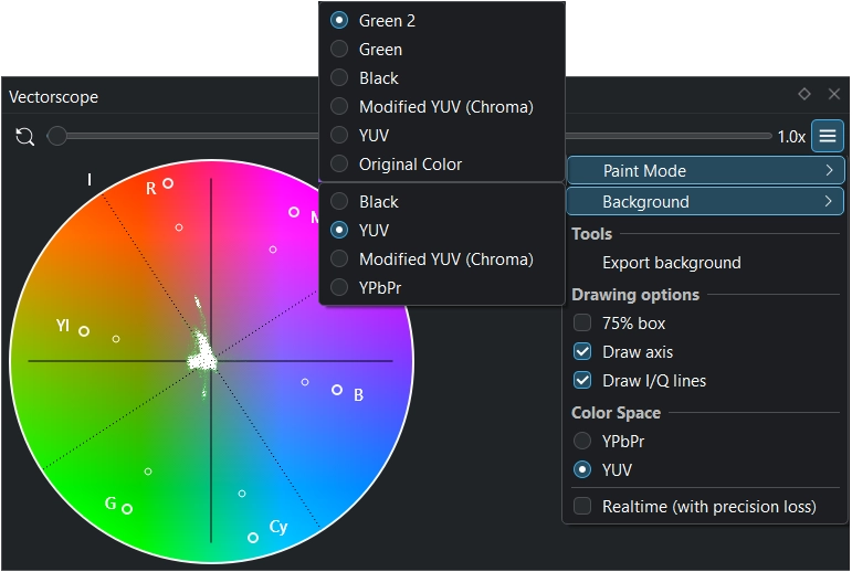 На цій панелі буде показано частотну гістограму освітленості компонентів кольорів відео. Ці дані є корисними при спільному використанні із ефектами виправлення кольорів для коригування кольорів на відео. Коригування кольорів включає збільшення яскравості або коригування балансу білого для забезпечення відтворення білого кольору білим, а не синім.
