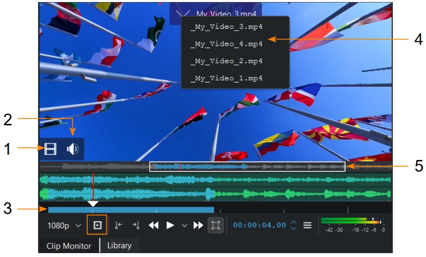 Наведіть вказівник миші у нижній лівий кут монітора кліпу, щоб отримати доступ до піктограм відео (1) і звуку (2). Клацніть лівою кнопкою миші на відповідній піктограмі для перетягування звукових даних або відеоданих на монтажний стіл.