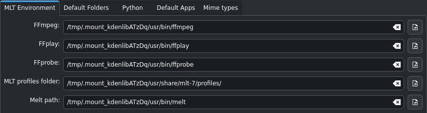 These settings tell Kdenlive where to find the MLT executables and profile files. Only advanced users would really need to change these settings. Kdenlive is basically a frontend to the MLT program. Since Kdenlive version 25.08, MediaInfo is not needed anymore as Kdenlive can read the timecode directly from MLT and shows these details in the clip properties. The values differ depending on your OS.