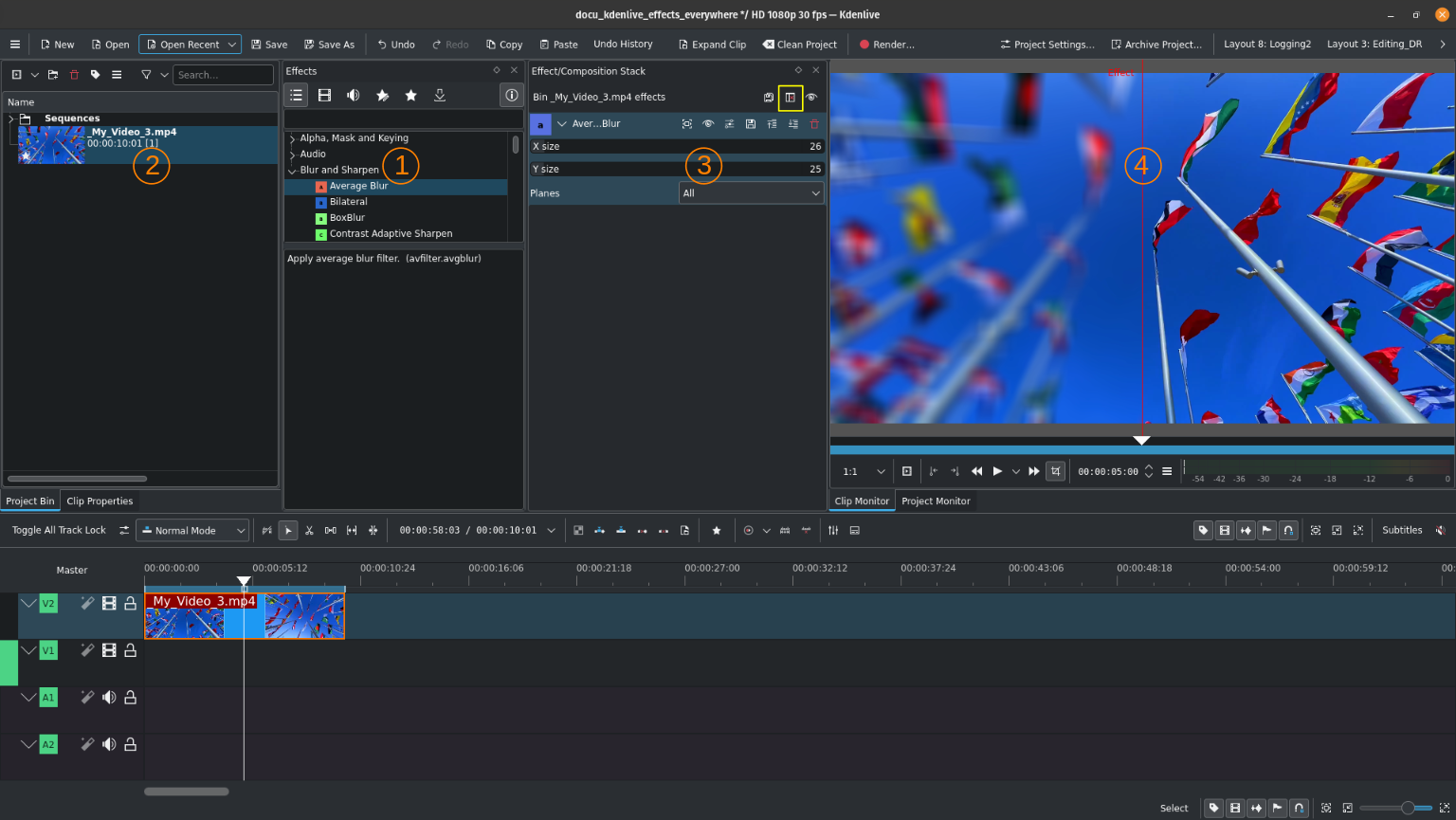 Left half of clip monitor (4) shows your bin clip with all effects applied; the text «Effect» to the left of the red divider (4) is the indicator of which side is showing effects and which side is without effects.