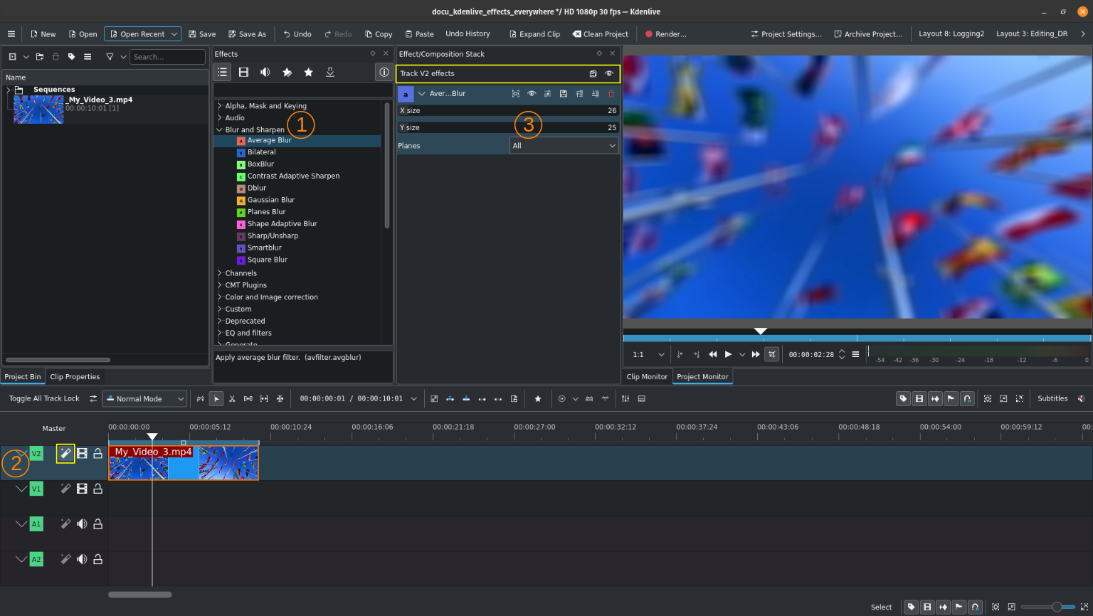 To apply effects to a clip in the project bin in general, simply drag and drop an effect from the effects widget (1) onto your clip in the project bin (2). The effect stack widget (3) then will switch to the effects applied to this particular bin clip. Adjust as you like.