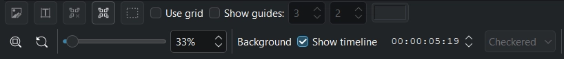 When selected, the content of the clip in the timeline below the title clip is displayed. Timecode: You can change the timecode or seek when holding the LMB and dragging left and right (Shift+drag or MW for 1 frame, Ctrl+MW for 5 frames, Ctrl+drag for fast seek). If not selected, the background can be set to Checkered, Black, or White.