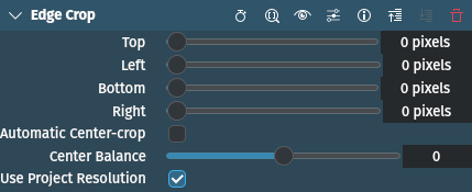 As of this writing and in version 23.04 this effect still behaves strangely. The parameter values seem to interfere with each other and it is not possible to have all four sides being cropped. It is either top/bottom or left/right and only the last value entered is applied (and then on both sides). Until this is fixed it is recommended to use the Crop, Scale and Tilt effect.