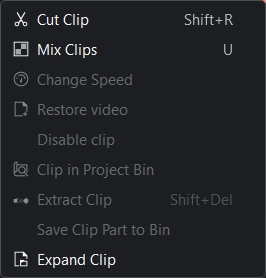 Mix Clips: Creates a same-track-transition between the selected clips. Only works if they are adjacent to each other and on the same track. Default shortcut: U