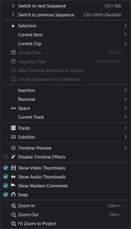 Switches on or off the display of video thumbnails for the clips in the Timeline. Use the track right-click menu item Thumbnails to select which thumbnails will be displayed.